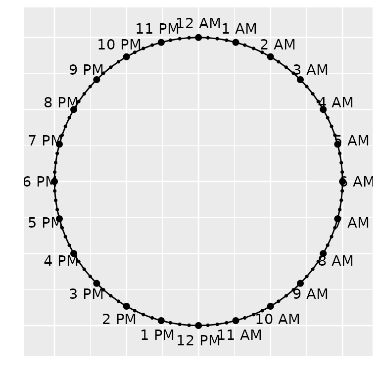 minutes. Thus, a small point on @ref(fig:clock24) in the middle of two
