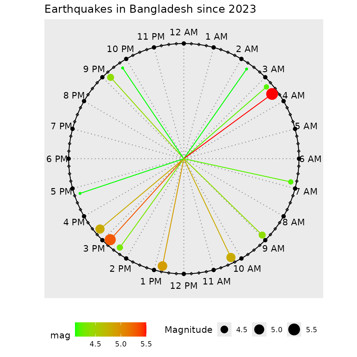 p + ggplot2::labs(size = "Magnitude", title = "Earthquakes in Bangladesh since 2023")